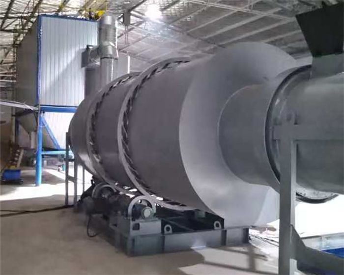 該烘干機工作原理:物料由供料裝置進入回轉滾筒的內層,實現順流烘干,物料在內層的抄板下不斷抄起、散落呈螺旋行進式實現熱交換,物料移動至內層的另一端進入中層,進行逆流烘干,物料在中層不斷地被反復揚進,呈進兩步退一步的行進方式,物料在中層既吸收內層滾筒散發的熱量,又吸收中層滾筒的熱量,同時又延長了干燥時間,物料在此達到干燥狀態。物料行至中層另一端而落入外層,物料在外層滾筒內呈矩形多回路方式行進,達到干燥效果的物料在熱風作用下行進排出滾筒,沒有達到干燥效果的濕物料因自重而不能快速行進,物料在此矩形抄板內進行充分干燥,由此完成干燥目的。